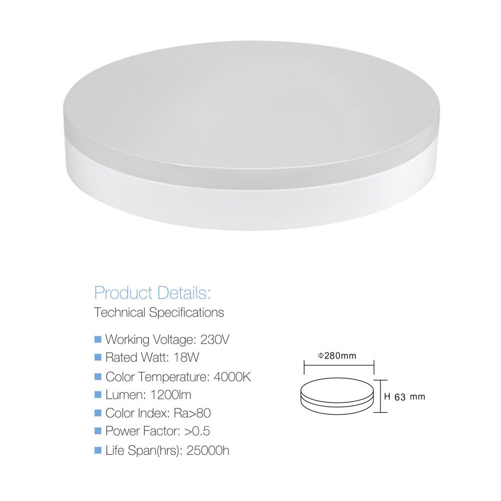LED 18W, 100-240V, 4000K, 1200lm, IP44, dimenzije artikla: 280 x 53mm (promjer x visina)