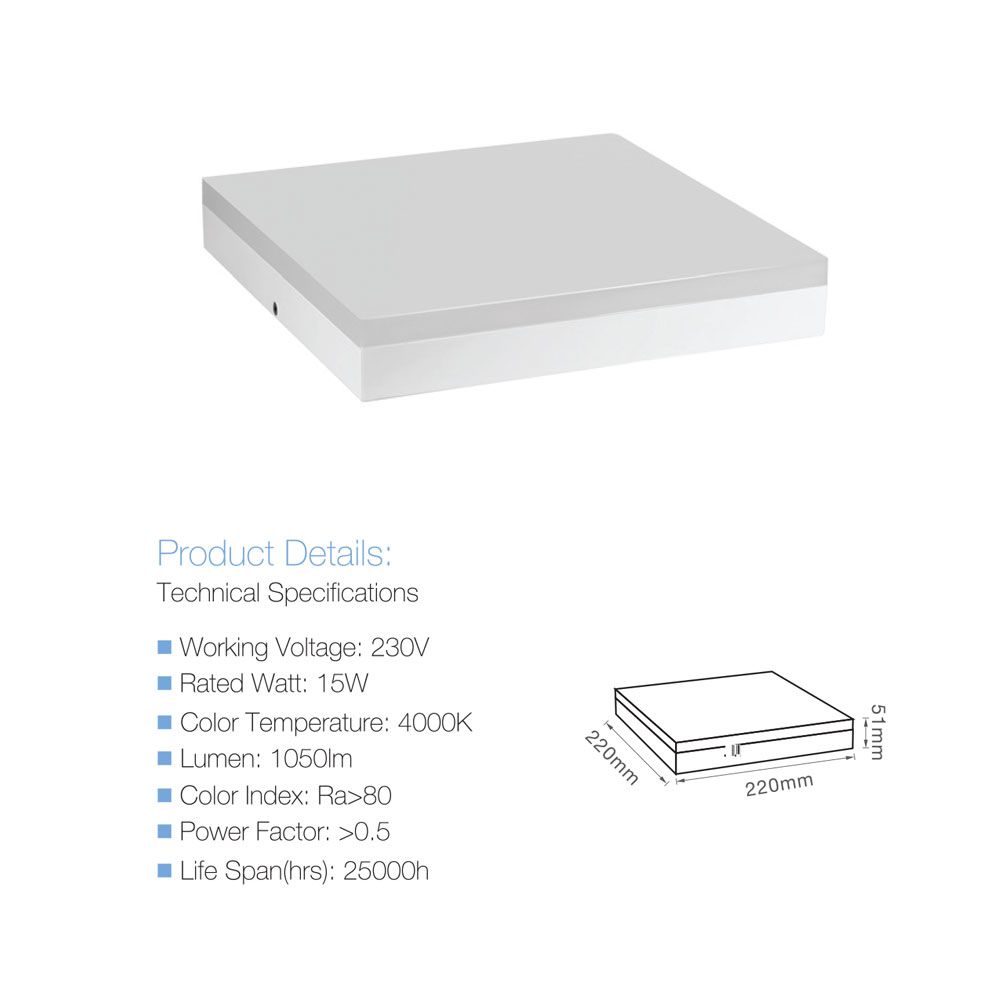 LED 15W, 230V, 4000K, 1050lm, IP44, dimenzije artikla: 220 x 220 x 51mm (dužina x širina x visina)